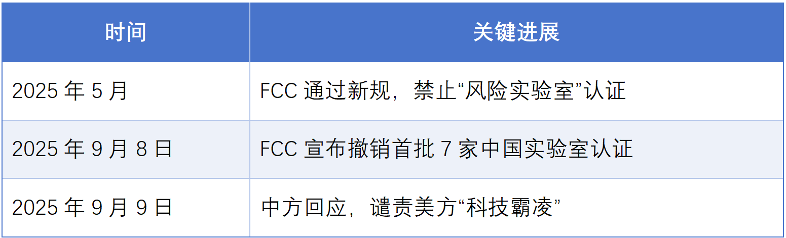 當(dāng)?shù)貢r間2025年9月8日,美國聯(lián)邦通信委員會(FCC)宣布撤銷對7家中國實(shí)驗(yàn)室的測試認(rèn)證許可,并拒絕續(xù)簽4家在新規(guī)生效后自然到期的中國實(shí)驗(yàn)室。此舉依據(jù)FCC在2025年5月通過的新規(guī),聲稱這些實(shí)驗(yàn)室“與部分國有企業(yè)或軍方有關(guān)聯(lián)的機(jī)構(gòu)存在深層聯(lián)系”,可能威脅美國國家安全。